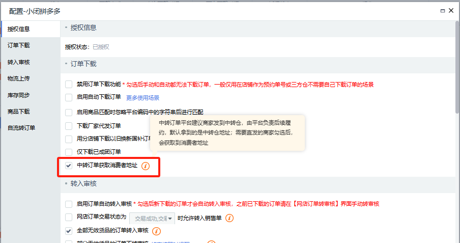 5、拼多多中转订单(新疆中转等)也支持获取消费者地址,需要直发的商家在网店配置勾选“中转订单获取消费者地址 ”
