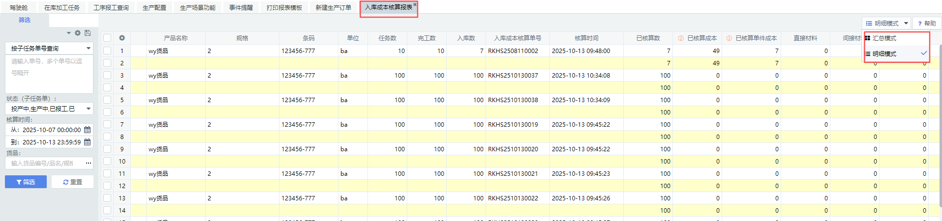 1.入库成本核算报表新增明细模式,在明细模式下,将显示各费用类别下的明细费用,同时支持导出;