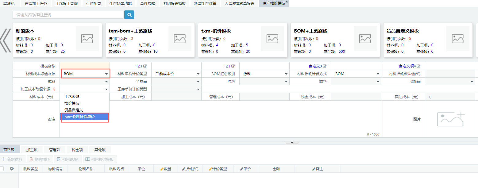 1.【生产核价模板】中,加工成本取值来源新增"bom物料计件单价"选项,若产品在核价时核价模板的加工成本来源是"BOM物料计件单价",则成品的加工费用取材料项在【生产物料】维护中维护的人工计件单价总和;