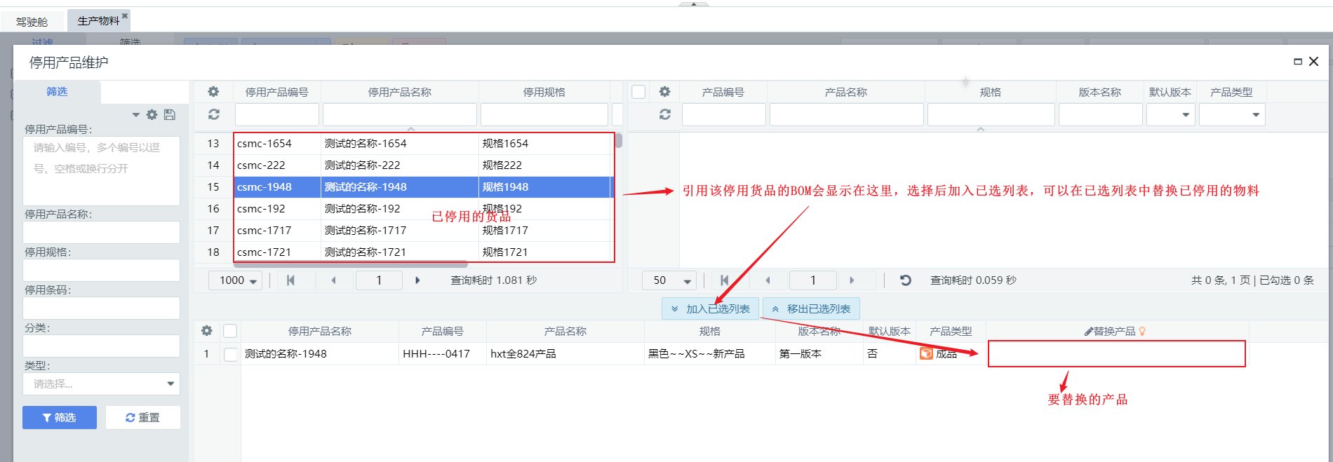 3.【生产物料】页面右上角"货品停用维护",该功能支持批量替换BOM中已停用的物料;优化功能: