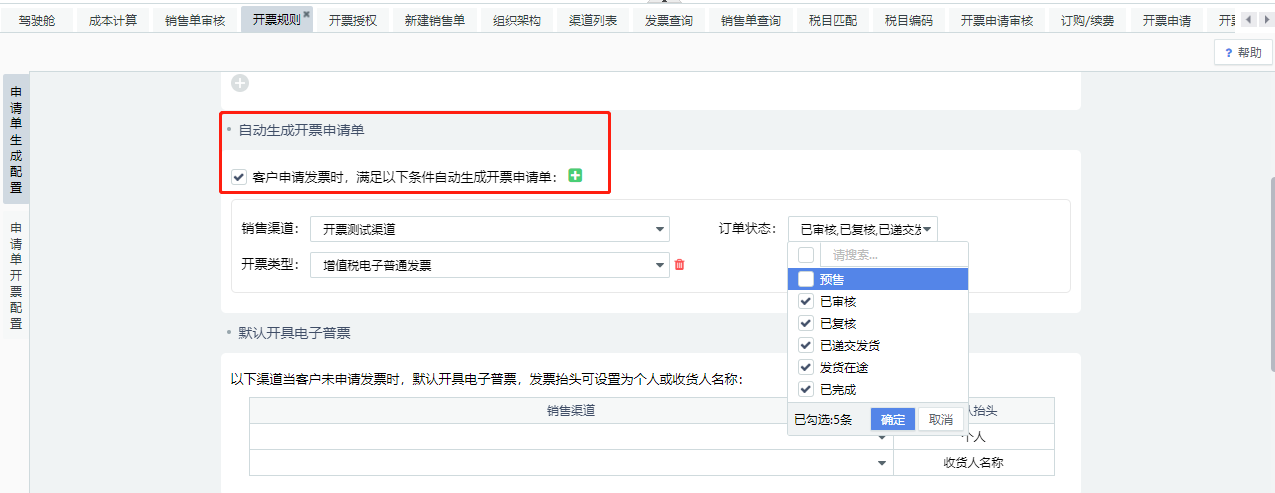 【开票规则】勾选“客户申请发票时,满足以下条件自动开具发票申请单