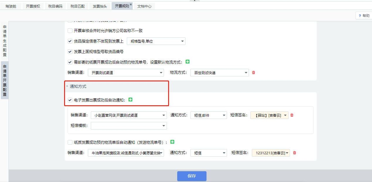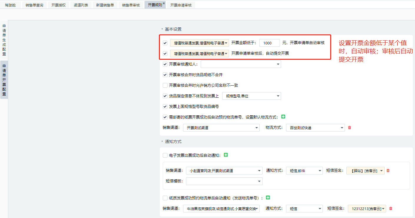 根据需求设置销售渠道及对应开票类型,在哪个订单处理节点自动开具发票
