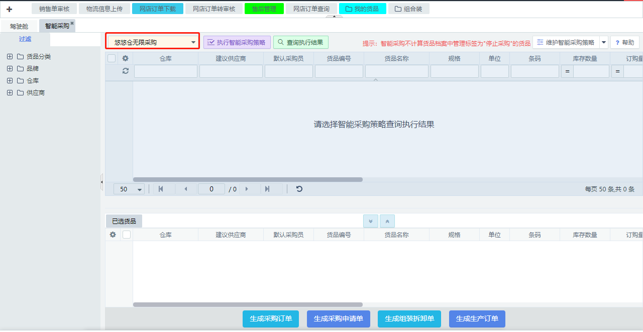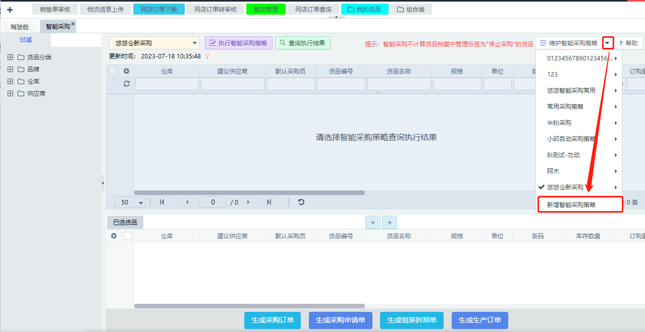 6.货品策略主要是确定智能采购计算的货品对象范围,可选择某一品牌或者某个分类