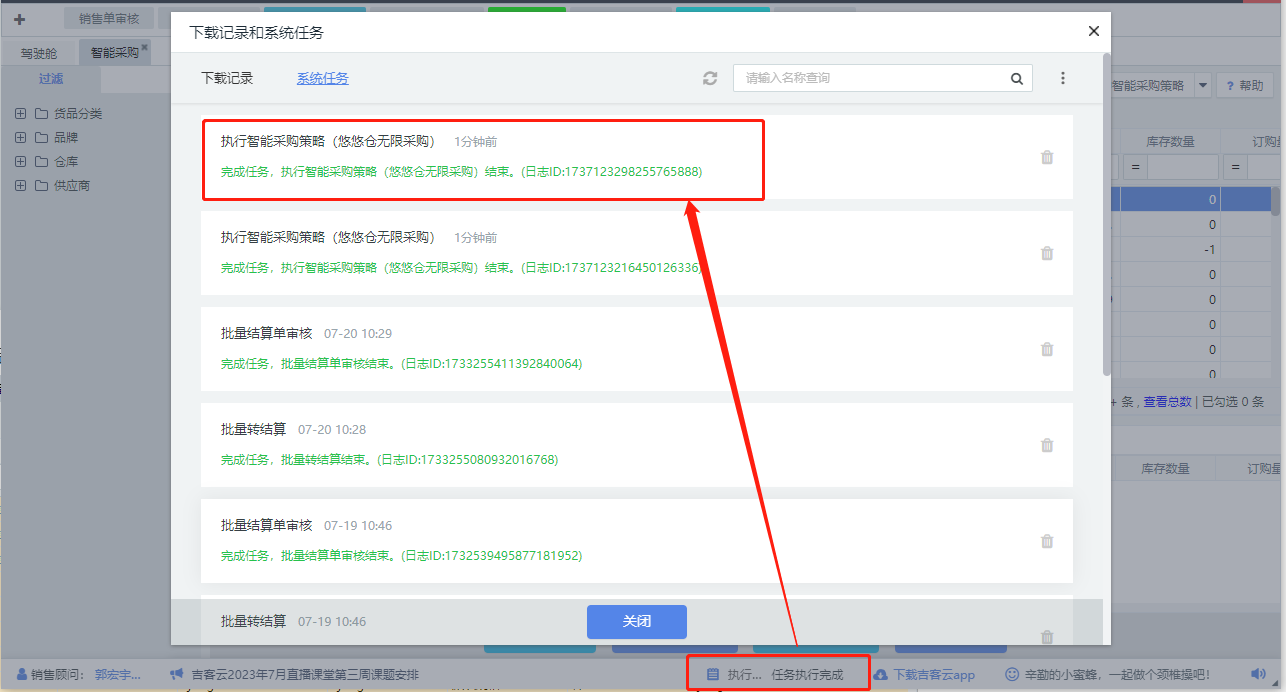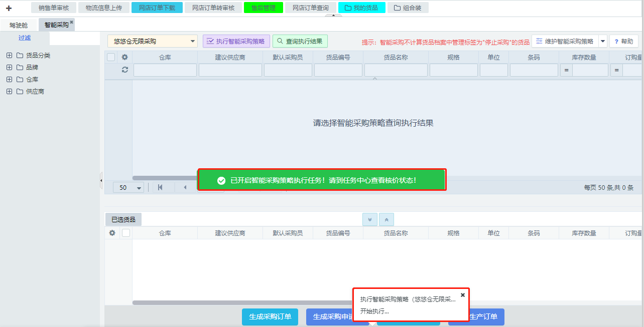 注意:策略是以任务形式执行,需要一定的时间,特别是选择的仓库以及货品范围较大的情况下,用户可关注系统任务的执行进度和结果