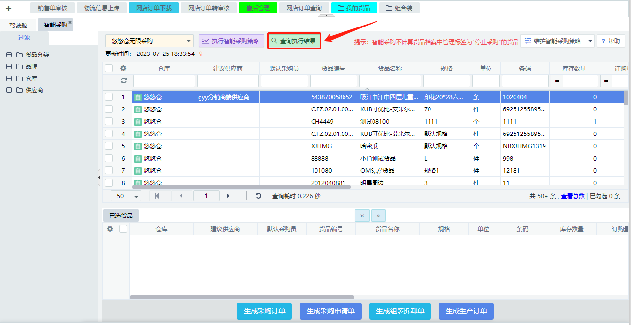 任务执行完成后,点击【查询执行结果】,下方会显示要采购的货品及数量