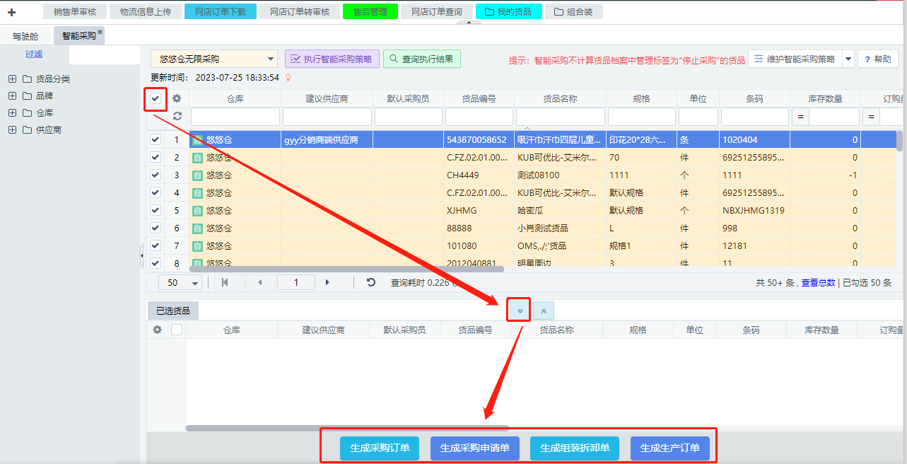 批量选中智能采购货品,点击下图所示“倒三角”按钮,将货品添加到“已选货品”,然后根据场景进行转采购订单,或者转生产、组装拆卸等。