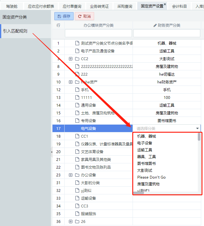 1.已经在【引入匹配规则】引用过的财务资产分类,则不允许在【固定资产分类】中删除该分类。