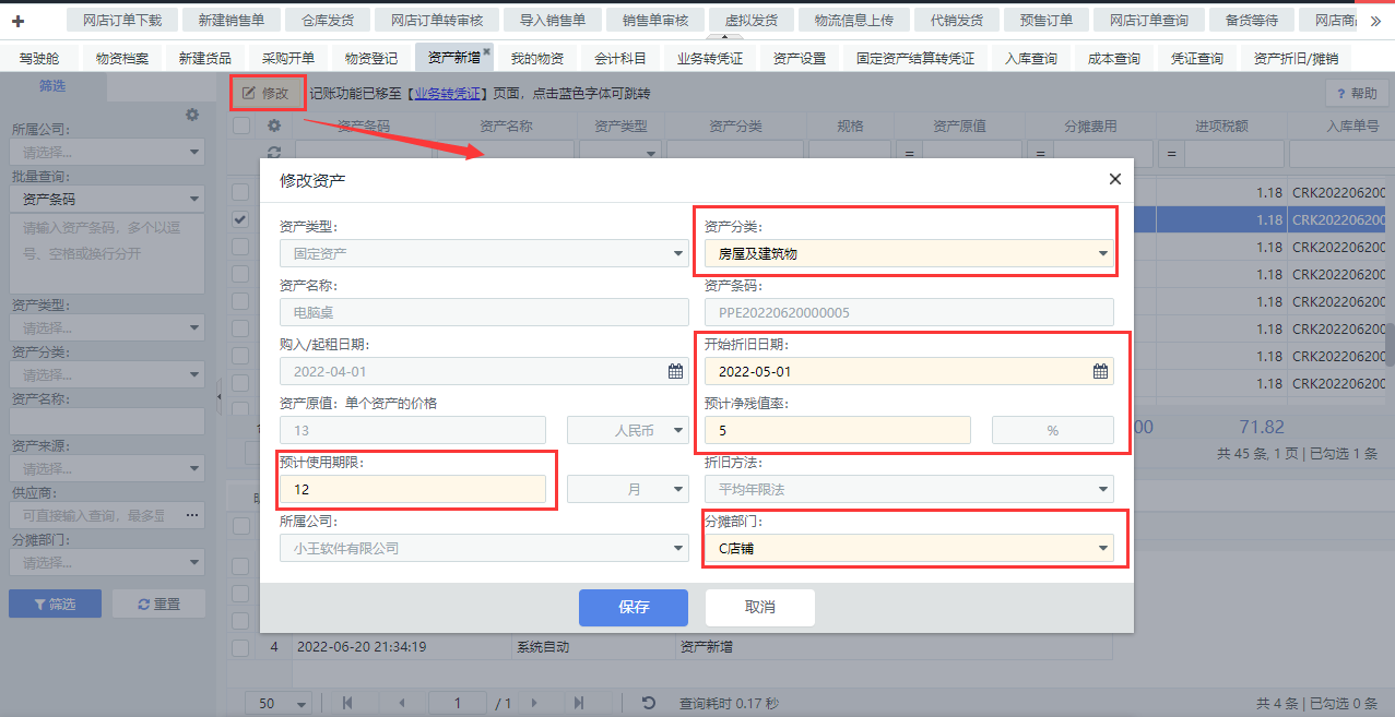 若前期未做资产设置,则需在【资产自增】中新增的增产进行资产分类修改,勾选单据,点击【修改】,对弹框中【资产分类】【开始折旧日期】【预计净残值率】【预计使用期限】【分摊部门】进行修改,这些选项支持批量修改。