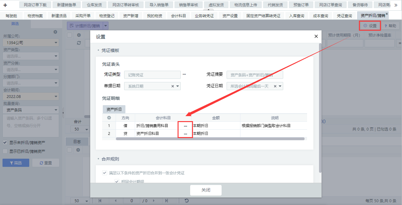 1.右上角的【设置】处,设置折旧取的会计科目。