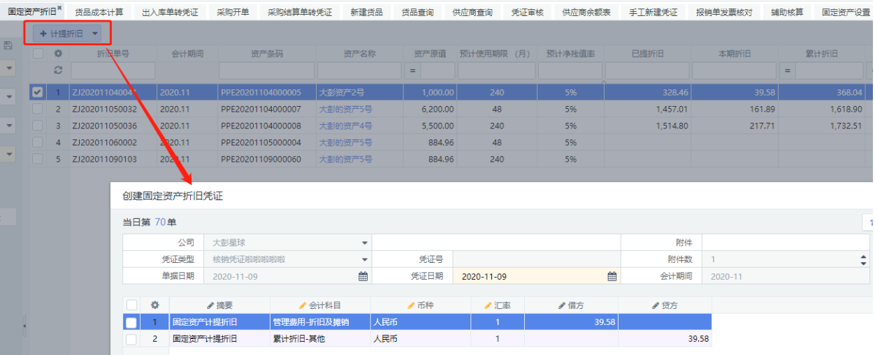 1.支持批量操作折旧的功能,每条资产每月只能折旧一次。