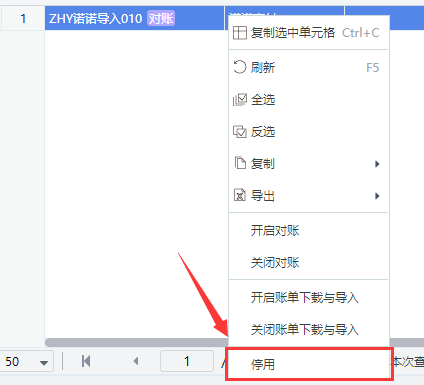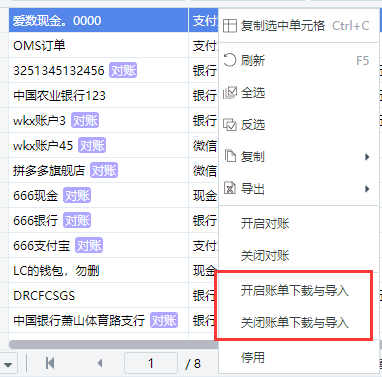 在结算账户列表中右键点击需要开启/关闭账单下载与导入的结算账户信息,在下拉列表中选择【开启账单下载与导入】/【关闭账单下载与导入】按钮,系统将开启/关闭该结算帐户的账单下载功能。开启了账单下载与导入功能的结算账户可在账单下载页面进行配置和下载。