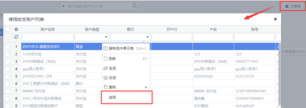 点击结算账户页面右上角【已停用】按钮,系统将弹出停用结算账户列表页面框,在停用结算账户列表中选择需要重新启用的结算账户信息,右键点击选中的结算账户信息,在下拉菜单中点击选择【启用】选项,系统将重新启用该结算账户并将其从停用结算帐户列表中删除。