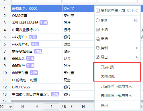 7.开启/关闭对账