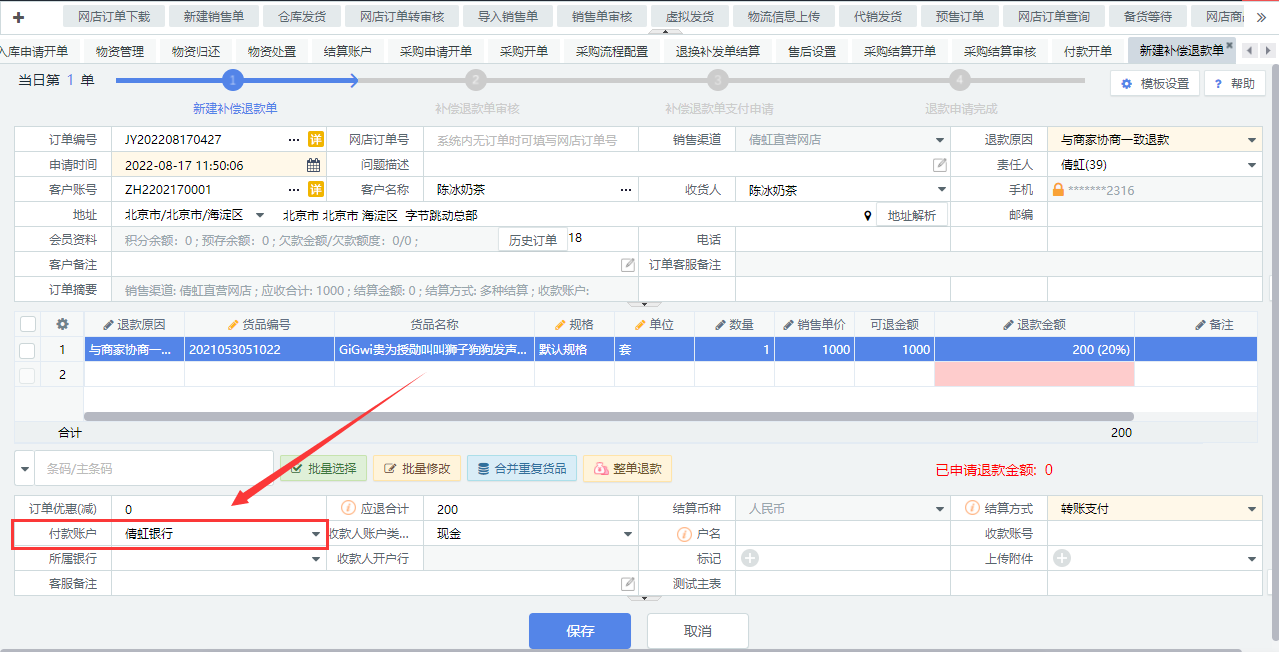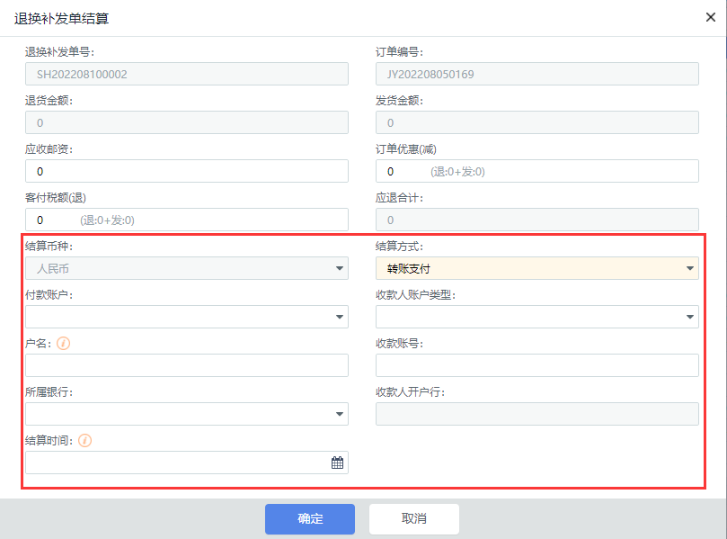 1)退换补发单结算时,选择对应的结算方式及付款账户