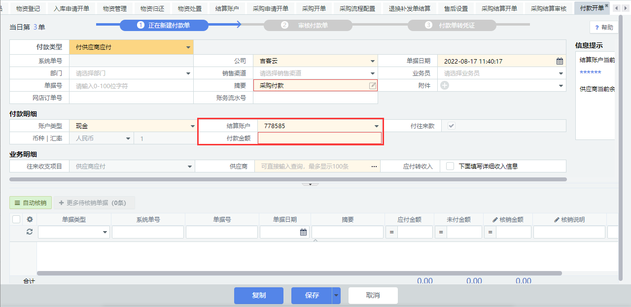 采购结算完成后转入财务的付款开单,选择对应结算账户,并输入付款金额