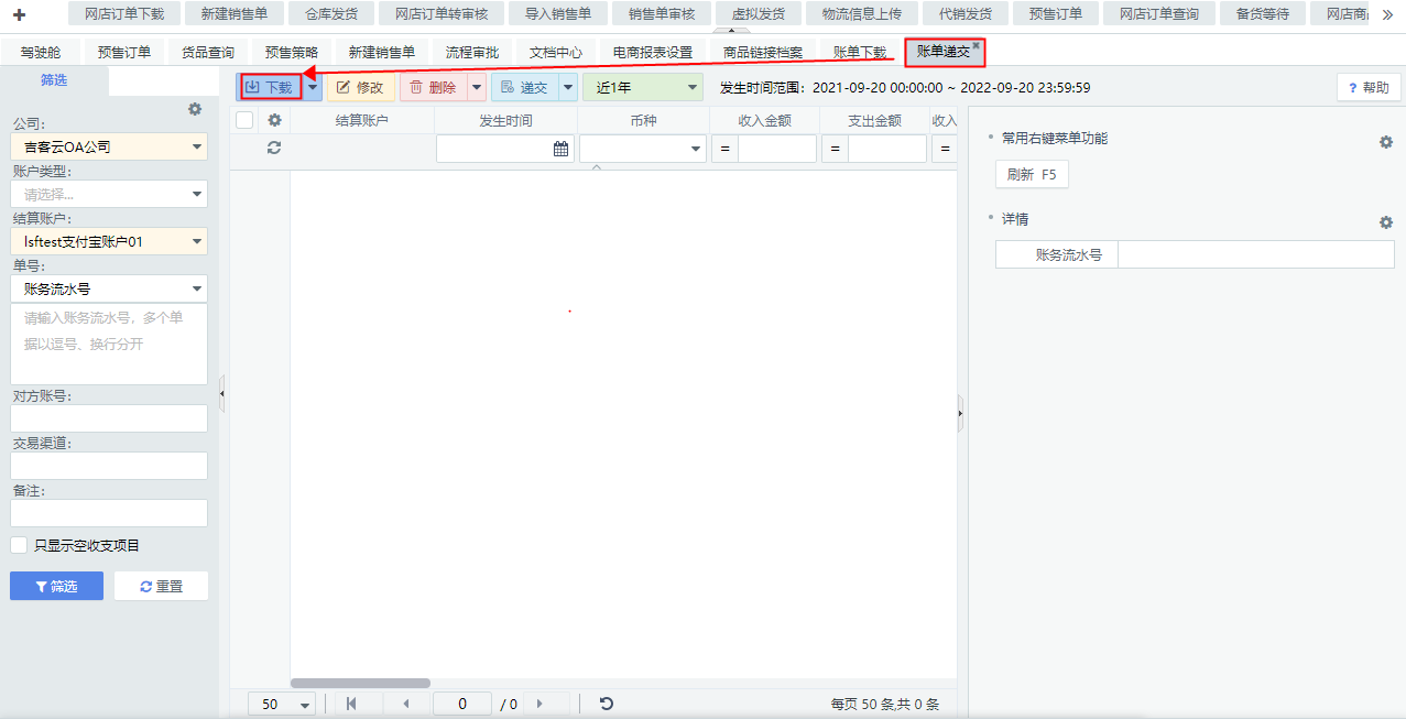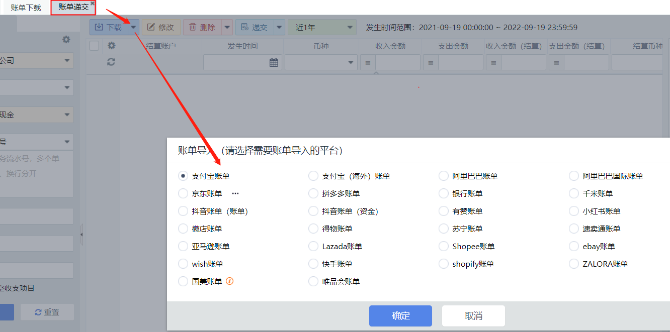 账单导入功能在【账单递交】页面,点击下载右边的三角形,在下拉选项中选择账单导入功能,根据平台下载相应的模板。如果该平台在这个页面里没有相应的模板,可以选择银行账单模板,根据模板整理数据进行导入。