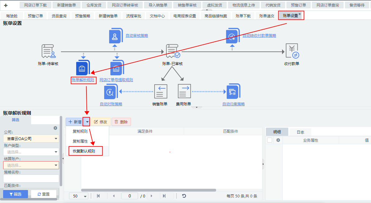 账单解析规则页面,可以使用恢复默认功能,点击【账单解析规则】页面的【新增】按钮右边的向下箭头, 在下拉选项框中,选中“恢复默认规则”,重置系统内置的解析规则。
