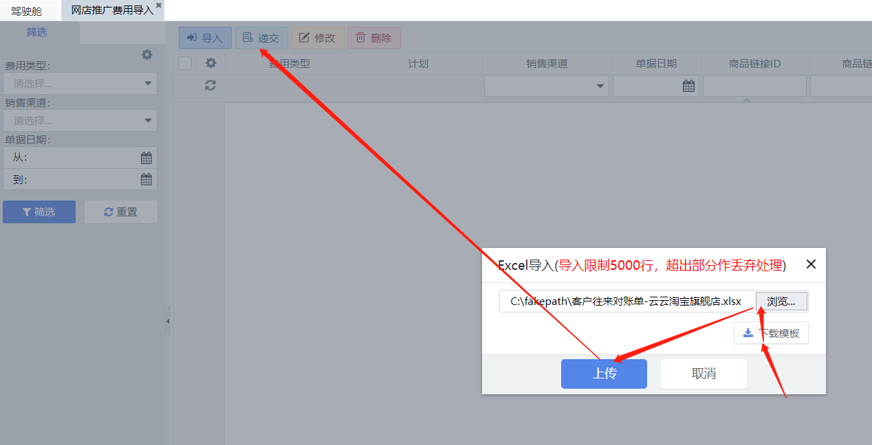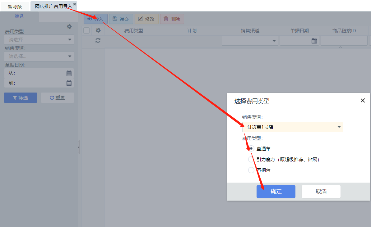 在“网店推广费用导入”里点击【导入】按钮,选择正确的销售渠道店铺,然后点击费用类型,