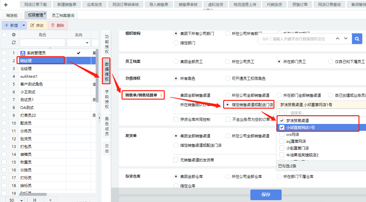 【权限管理】-选择对应的业务员角色-【数据授权】-【销售单/销售结算单】-勾选【指定销售渠道或配送门店】并选择业务员所负责的销售渠道,进行保存。