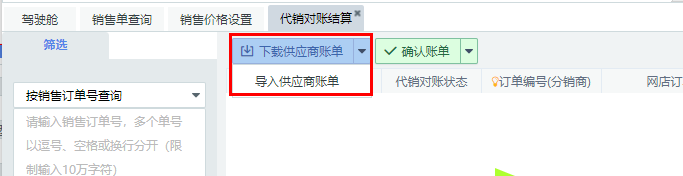 (1)分销商在代销对账结算页面左侧进行供应商对应账期订单的筛选;