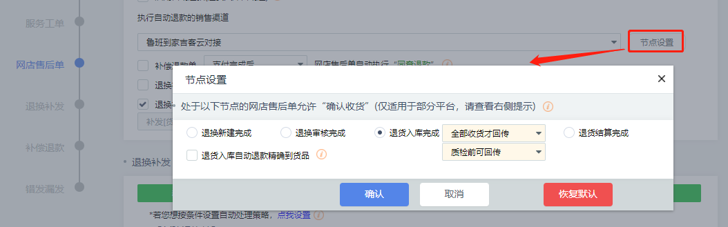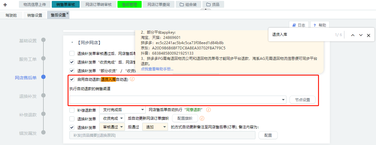 吉客云中【售后】-【售后单策略】-【售后设置】-【同步网店】勾选启用自动退款,并设置自动退款的销售渠道和退款节点。