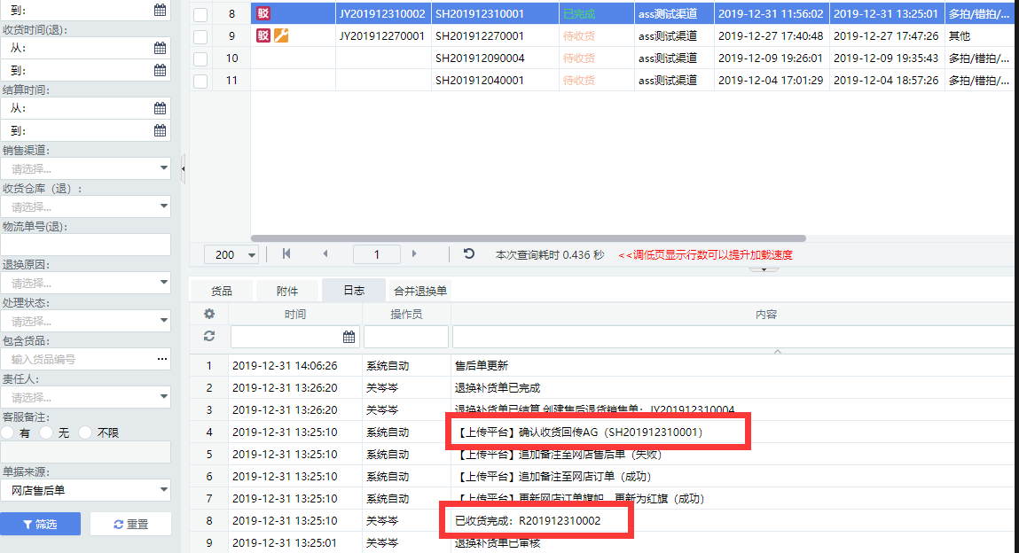 【退换补发单查询】页面可通过对应日志查看售后单流转情况。