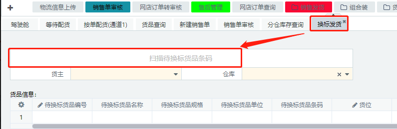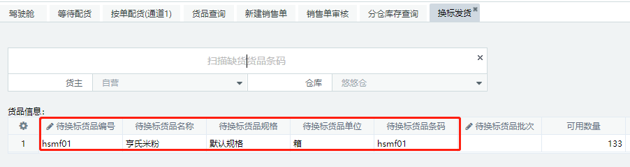 第一步、选择货主、货品所在存放仓库,扫描待换标货品条码(即上述需替换缺货货品B的货品A)