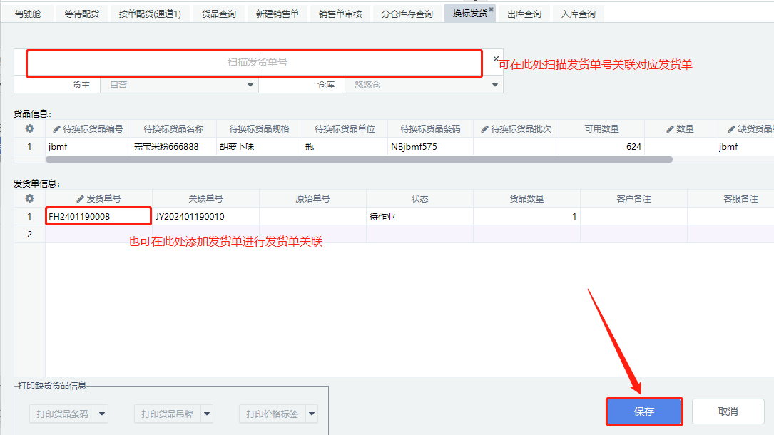 在扫描框扫描发货单号或者在【发货单信息】列表中添加发货单进行发货单关联后,点击【保存】。