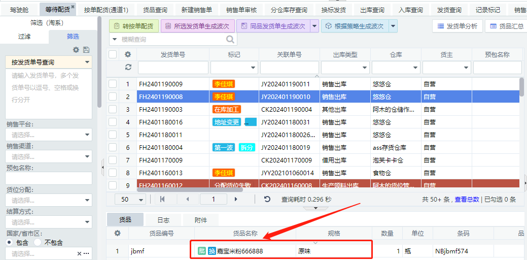 在【等待配货】、【发货查询】页面可查看对应发货单的换标发货货品会自动打上对应的标记。