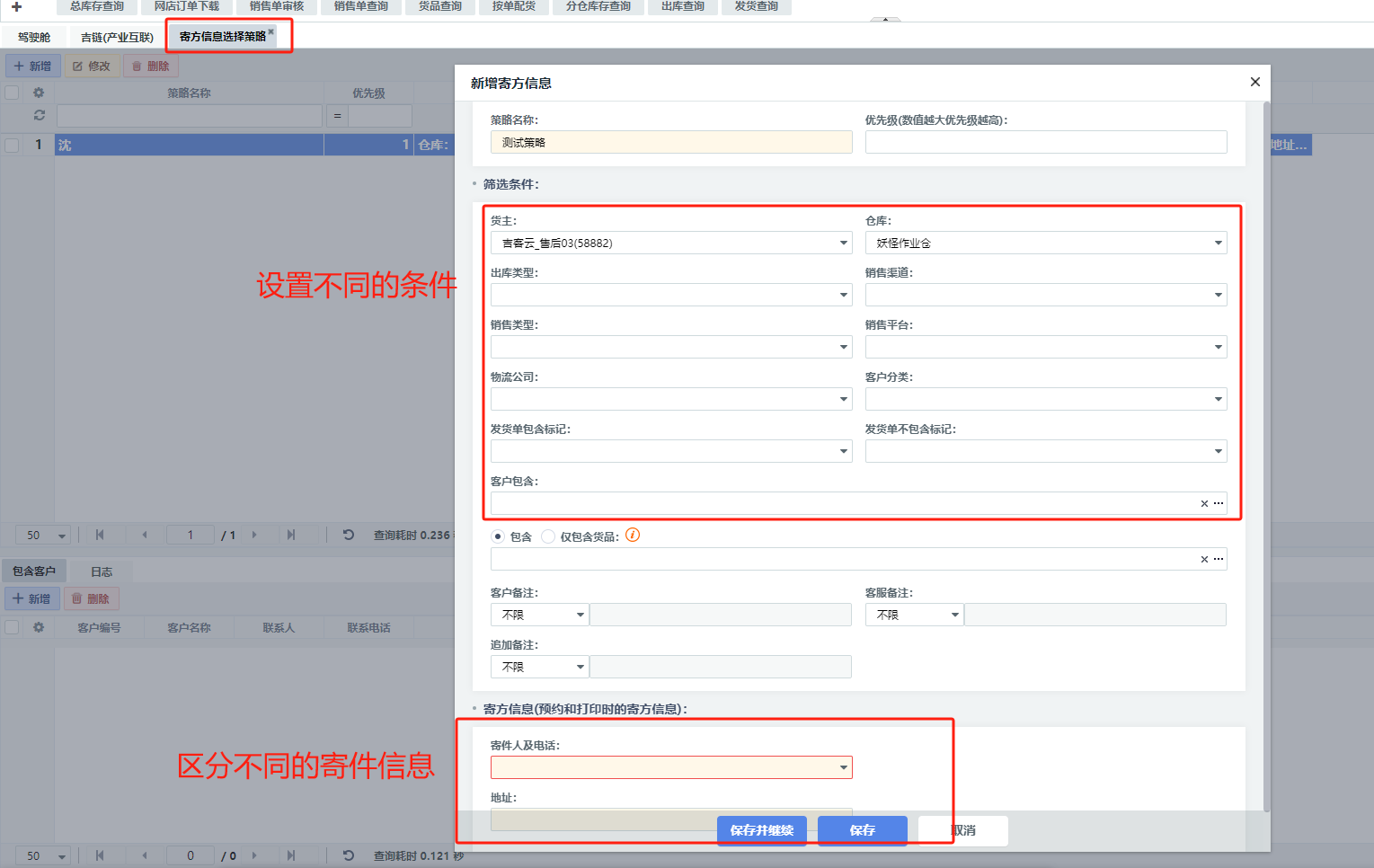 您可以在这个页面设置不同的策略区分开不同的寄件信息