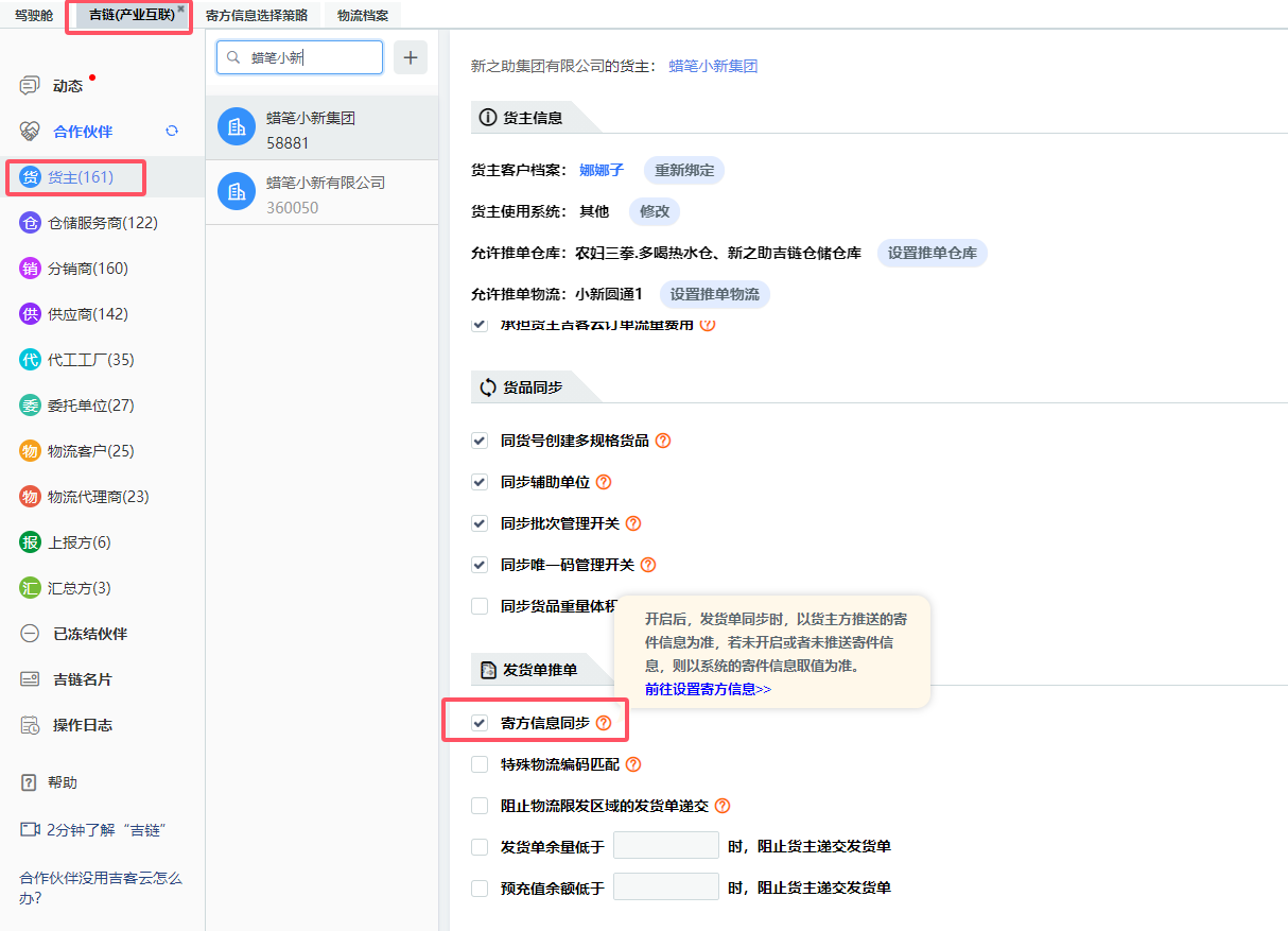 该项主要针对云仓业务,货主进行推单时,云仓作业时发货单/物流单优先看吉链页面是否勾选寄方信息同步,若勾选则按照货主方推送的寄件信息为主