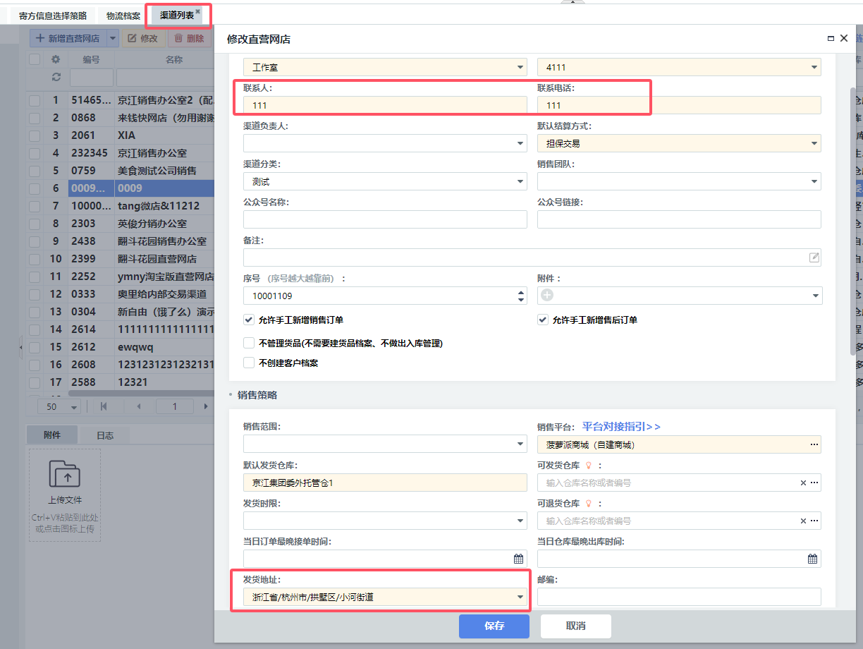 如果前面这些都没做设置,默认引用渠道列表的店铺联系人、电话和地址信息