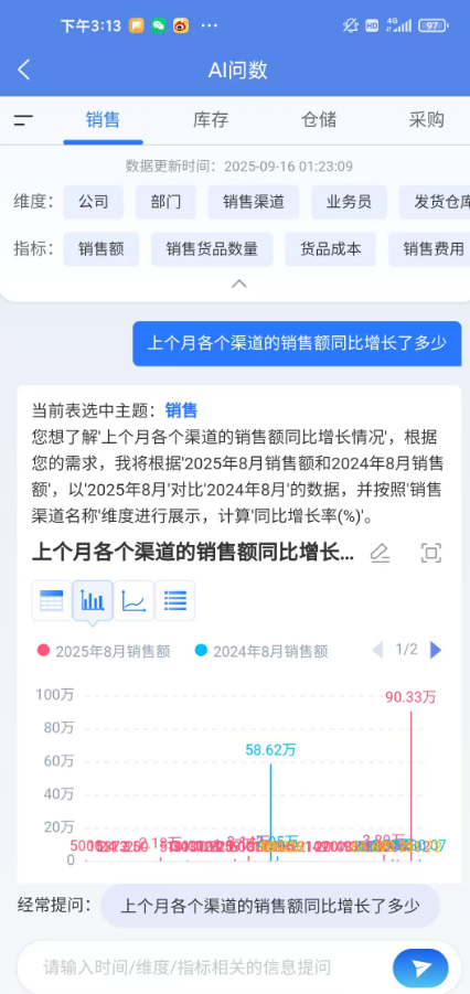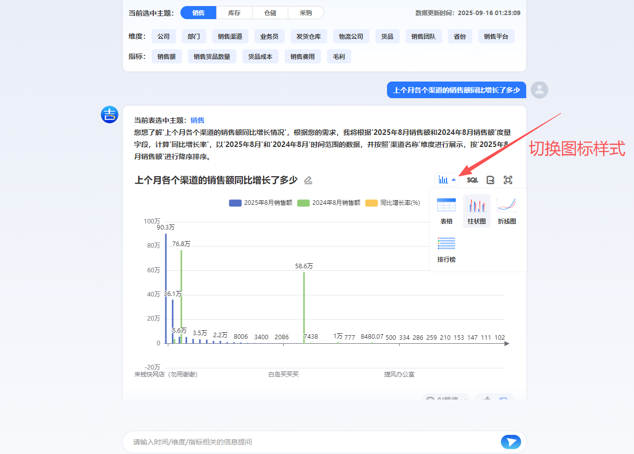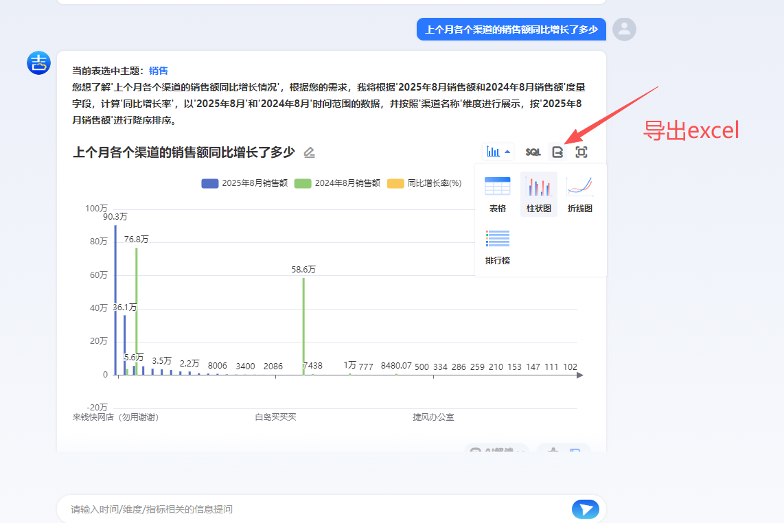 1.3、下面以销售主题做展示,在对话框输入问题,问题中需要包含您想统计的时间+维度+指标,例如输入“上个月各个渠道的销售额同比增长了多少 ”点击搜索以后,系统就会自动根据问题分析内容,并以可视化的图表样式展示结果。您也可以在右上角切换其他的图表样式查看或以excel文件格式导出该数据。