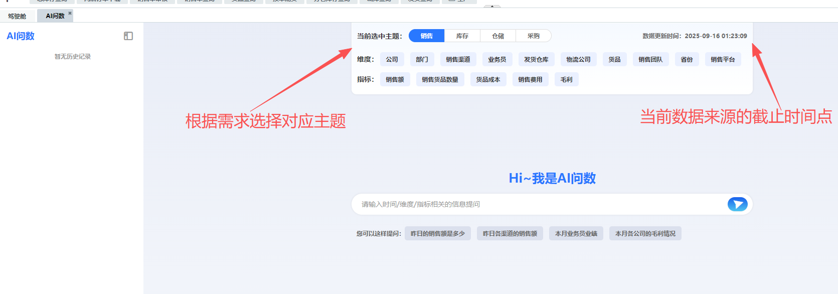 1.2、根据页面展示,选择需要提问的主题模块,页面右上角的时间是当前数据来源的截止时间点,在不同主题下,我们可以根据提供的维度和指标进行提问。