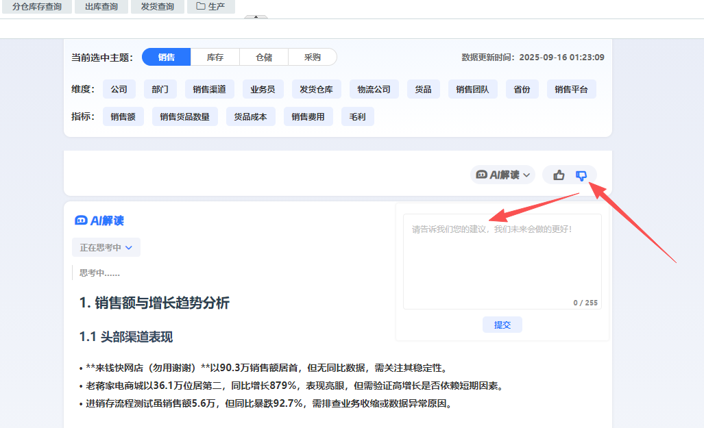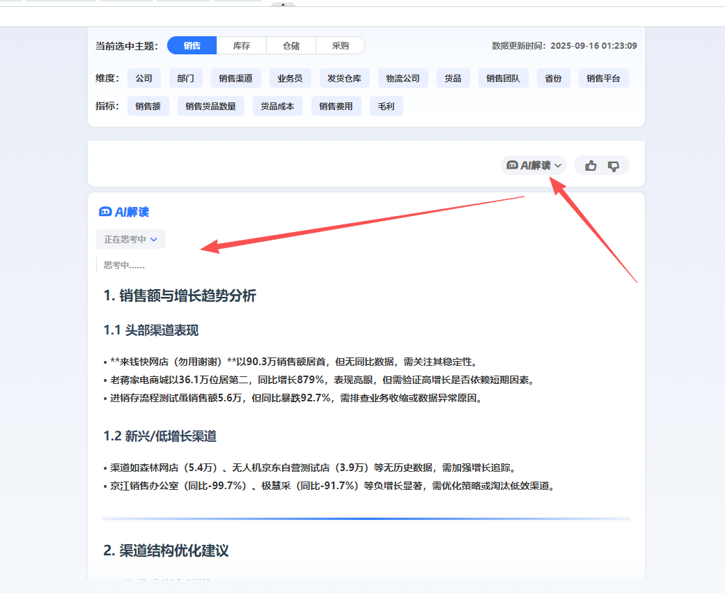 1.4、针对数据结果,您可以点击“AI解读”按钮,进一步解读该数据,以获得对应的数据分析。