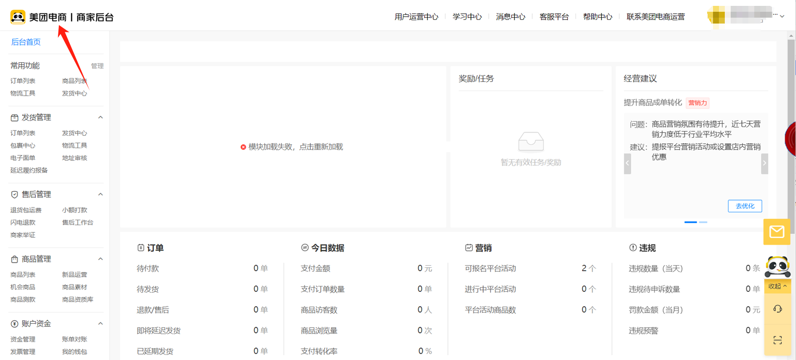 商家后台左上角是“美团电商”,渠道选择“美团电商”