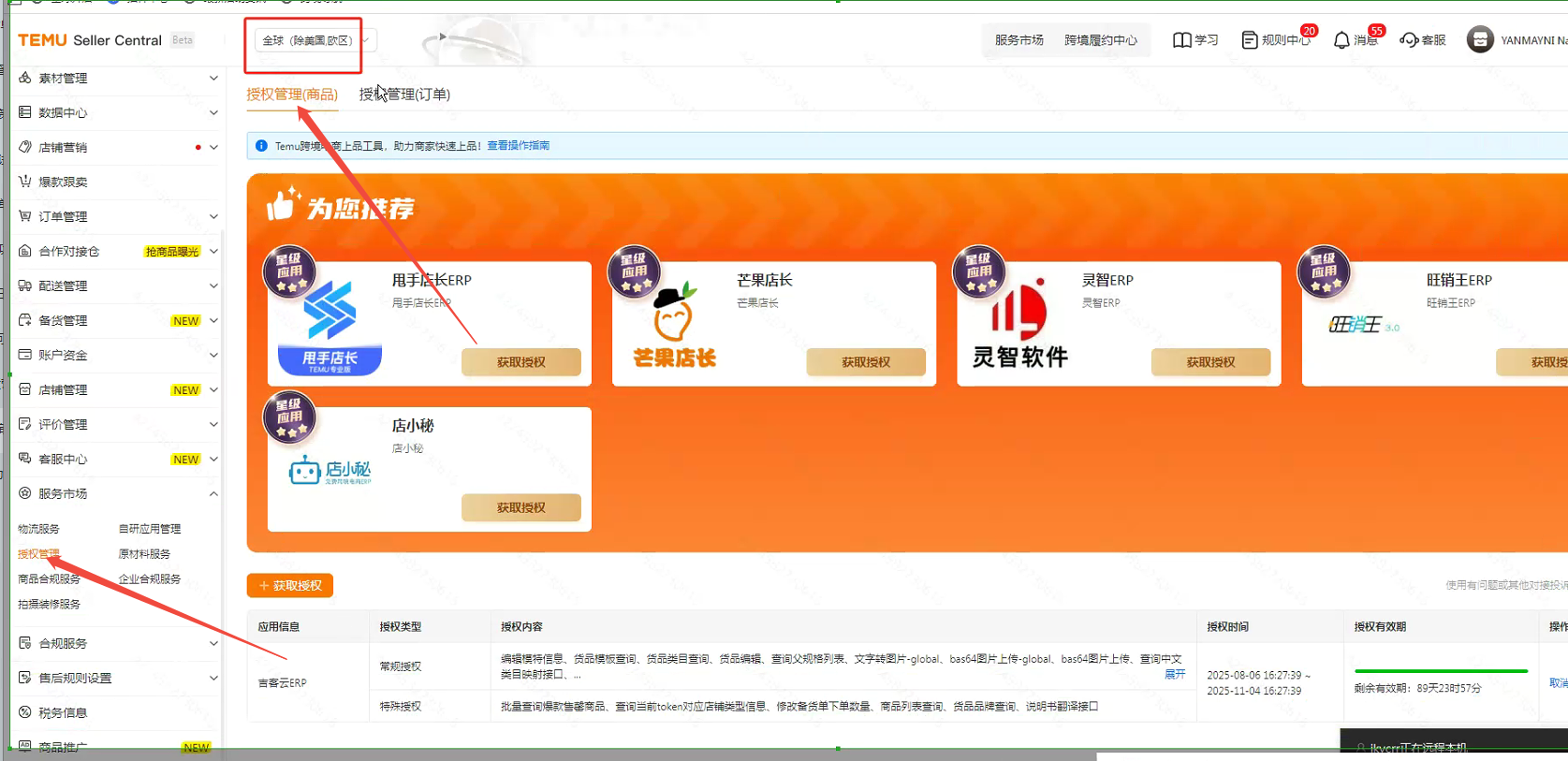 进入半托管店铺后台【服务市场--授权管理】,左上角切换到当前订单所属的站点,点击“获取授权”