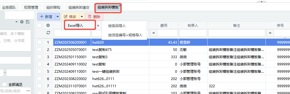 2)组装拆卸模板支持批量导入修改,包含费用信息