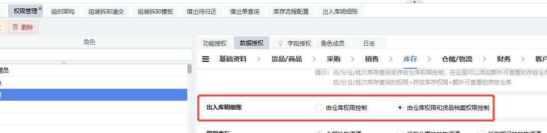 4、出入库明细账增加权限控制,可选项有“由仓库权限控制”“由仓库和货品档案权限控制”,默认选中“由仓库权限控制”