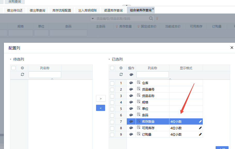 4)组合装库存和分仓组合装库存查询页面的库存数量、可用库存、订购量显示格式支持小数位精度设置