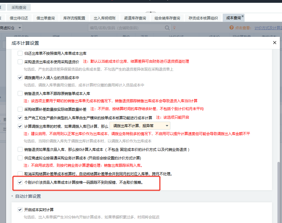 1、成本计算页面新增设置:个别计价法货品入库单成本计算按唯一码跟踪不到则报错,不走取价策略。