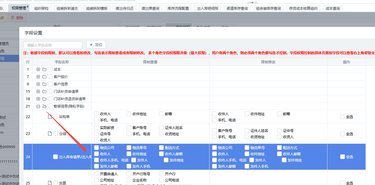 3、出库申请单相关页面的“单价”字段受“进货价”字段权限控制;出入库单/申请单敏感字段新增了物流信息和收发件人信息,控制相关页面的字段查看、编辑功能。