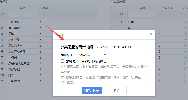 1、货品查询和组合装查询新建、修改详情界面的字段配置支持自定义同步范围。