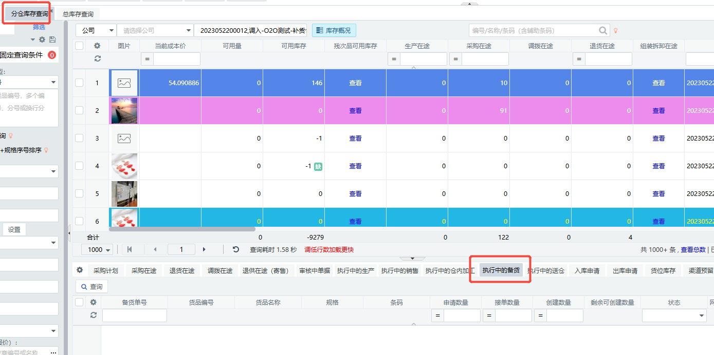 3)分仓库存查询页面增加了【执行中的备货】页签,受功能权限:分仓库存查询-执行中的备货 控制。