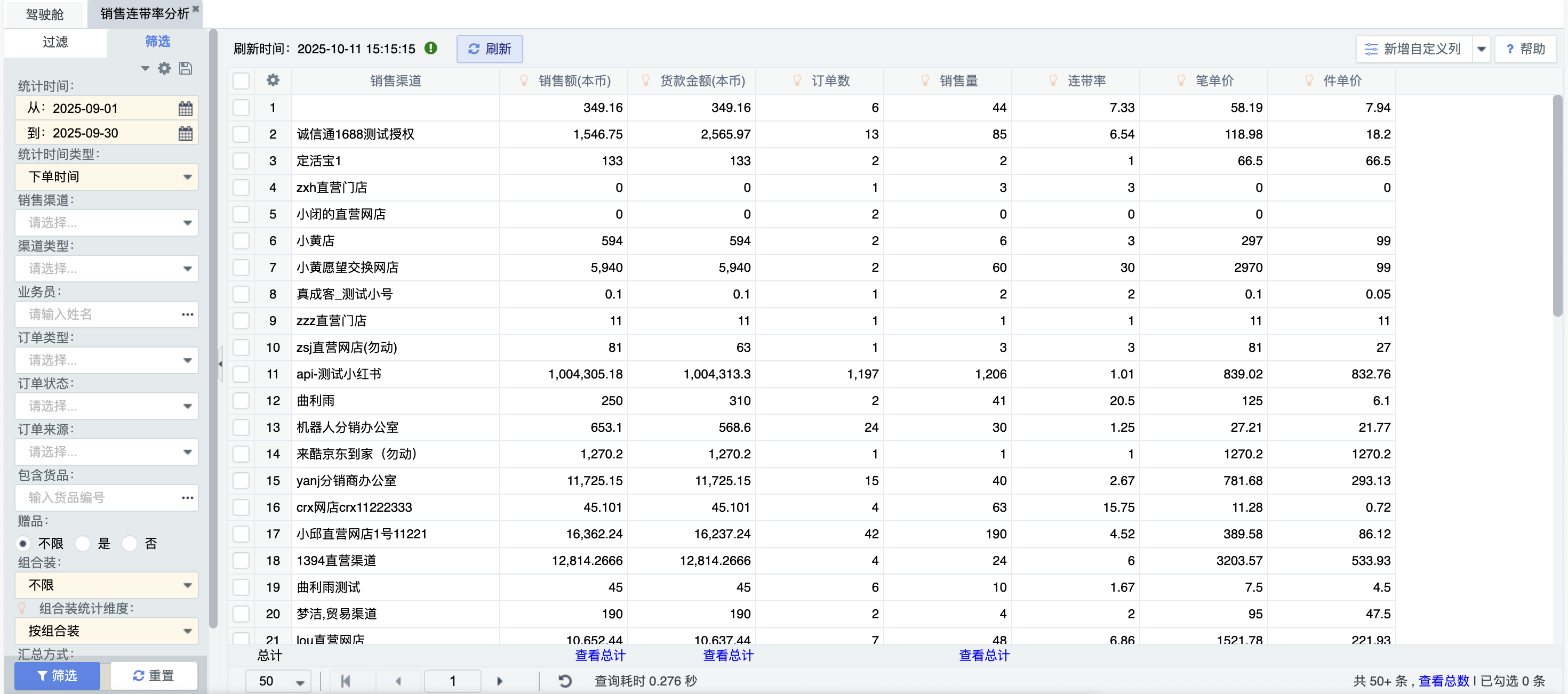 1、新增【销售连带率分析】,位于“决策-销售-渠道”,支持按渠道/业务员/货品查看连带率、笔单价、件单价等指标。