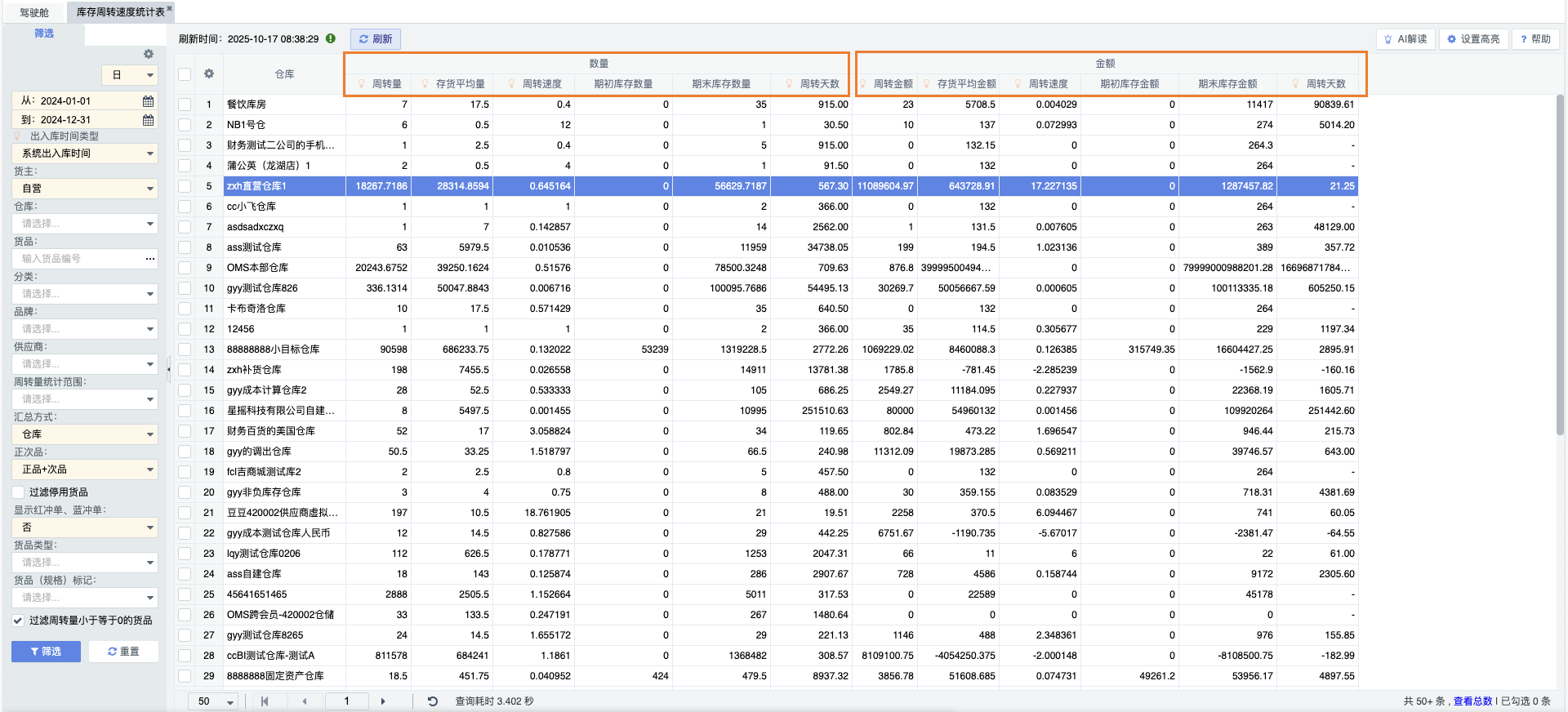 8、【库存周转速度统计表】支持从库存金额角度分析资金周转情况,新增“期初库存金额”、“期末库存金额”、“存货平均金额”、“周转金额”、“周转速度(金额)”、“周转天数(金额)”指标。