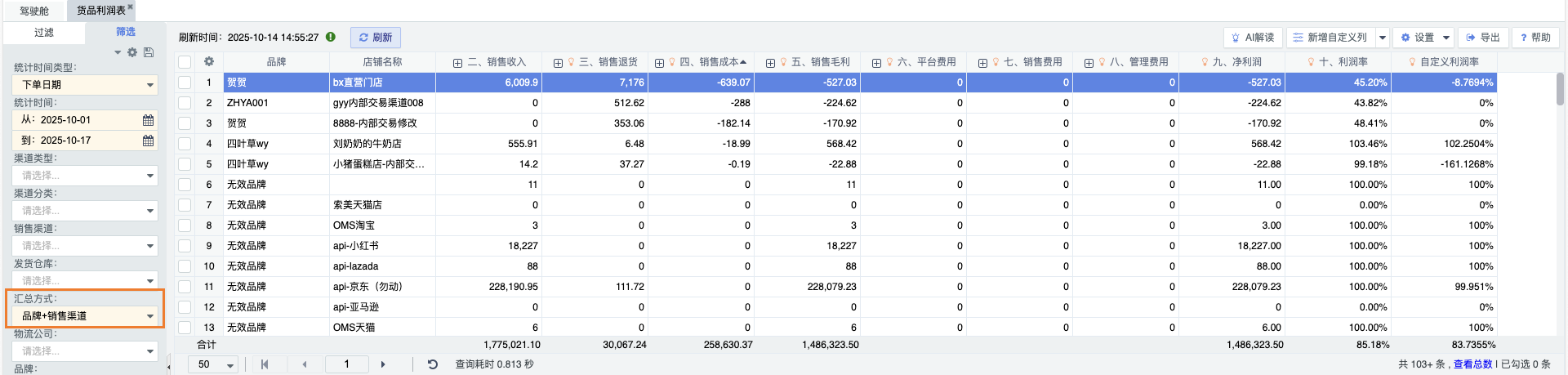 1、【货品利润表】支持按“品牌+销售渠道”汇总分析利润情况。