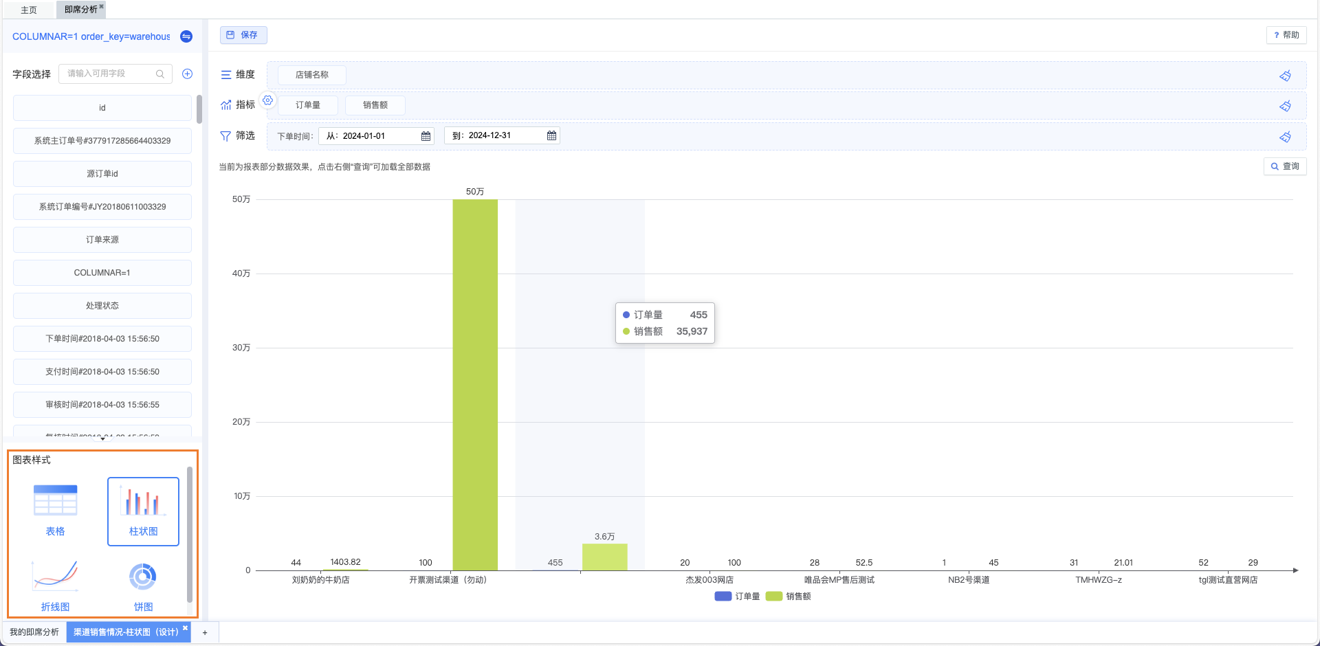 1、【即席分析】除表格样式外,新增柱状、折线、饼图等展示样式。