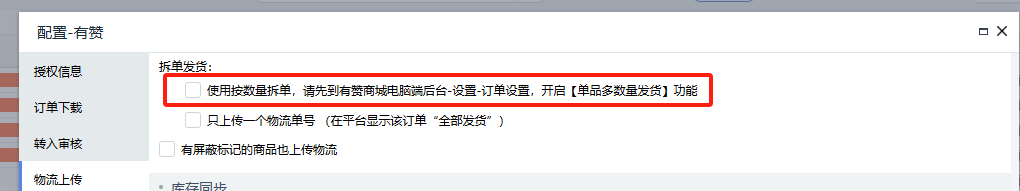 需要按数量拆单(单商品多运单)在有赞商家后台开启“单品多数量”发货功能后,回到网店配置勾选如下选项