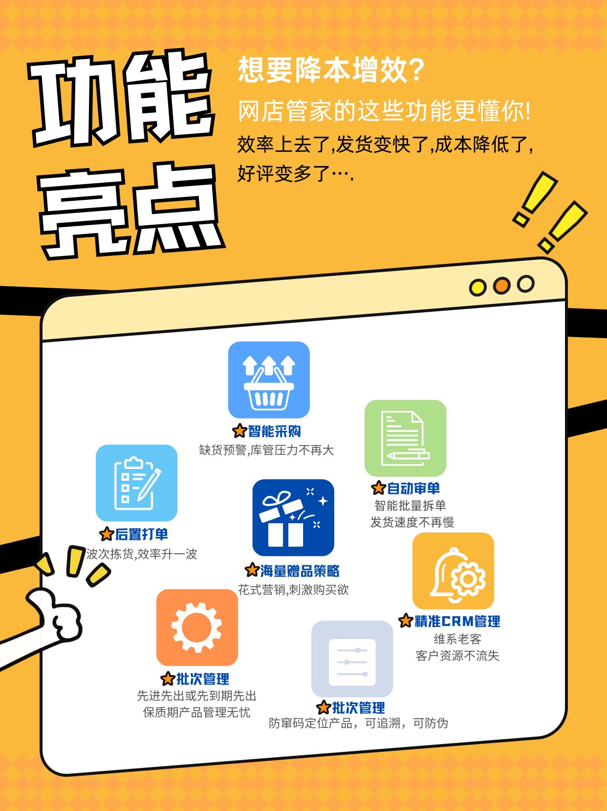 操作简单,易学易用: 网店管家ERP界面简洁、操作流畅,即使是没有IT背景的员工也能快速上手,大大降低了企业的学习成本。